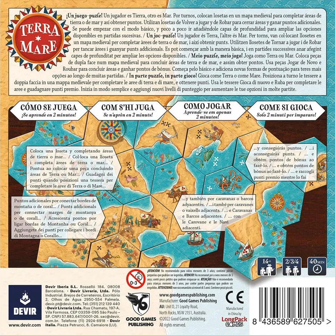 O jogo básico Terramare (Land vs Sea) é simples o suficiente para jogadores leves / familiares. Depois de jogares o jogo básico, podes desbloquear mais opções de pontuação nas peças para adicionares uma profundidade surpreendente:
