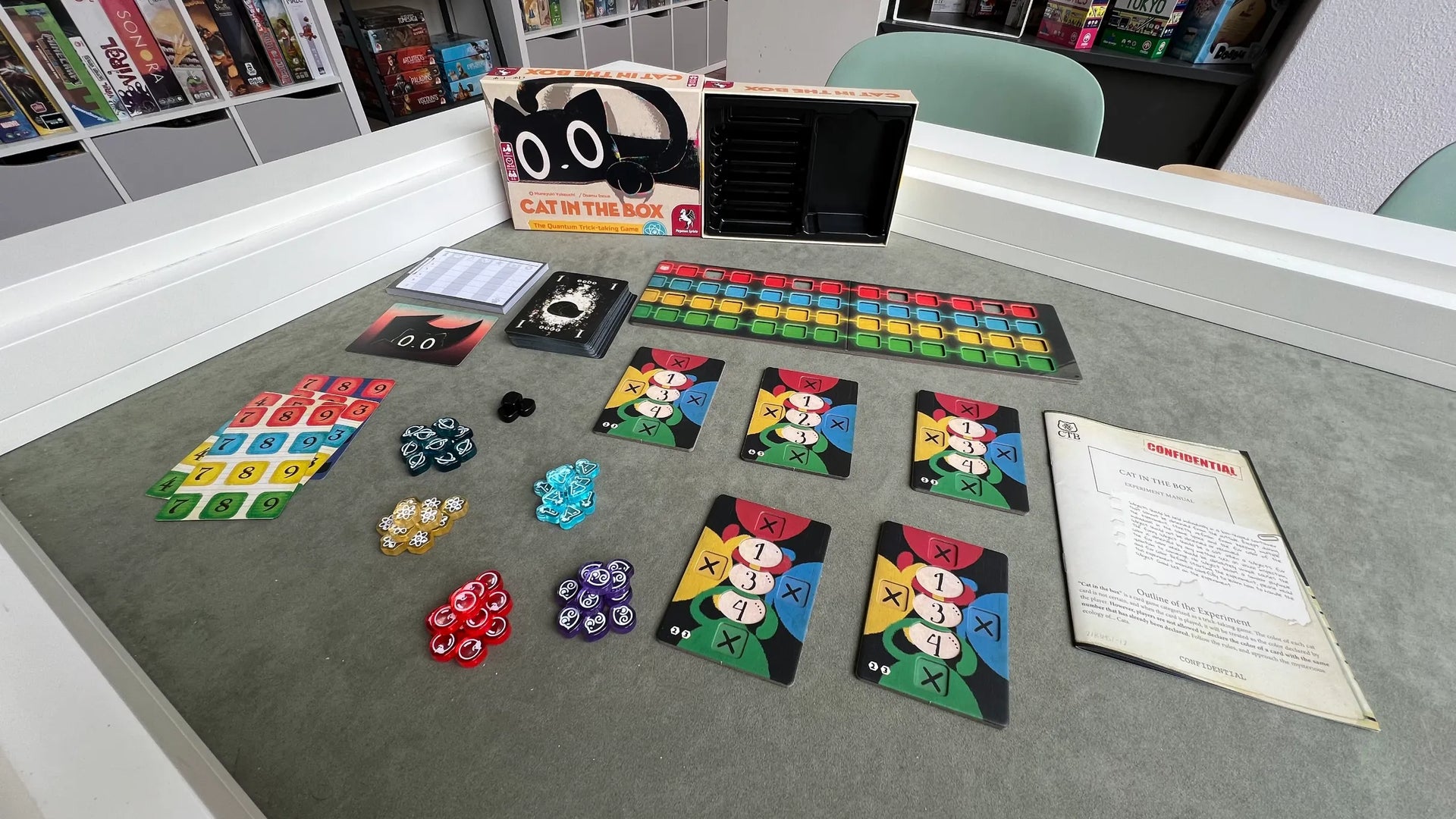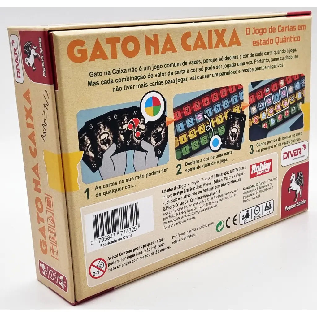 Gato na Caixa (Cat in the Box) é o jogo de cartas essencial de truques quânticos para 2 a 5 gatos fixes, onde a cor do teu cartão só é definida quando o jogas! Aposta em quantos truques vais ganhar e regista a tua oferta. Coloca fichas no quadro de pesquisa comunitário à medida que jogas a tua mão e liga grupos grandes de fichas para marcar ainda mais pontos. Planeia cuidadosamente as tuas vazas, pois não podes reivindicar a cor de um cartão com o mesmo número que já foi declarado. Fazê-lo seria pawsitivamente catastrófico, pois acabaste de criar um paradoxo!