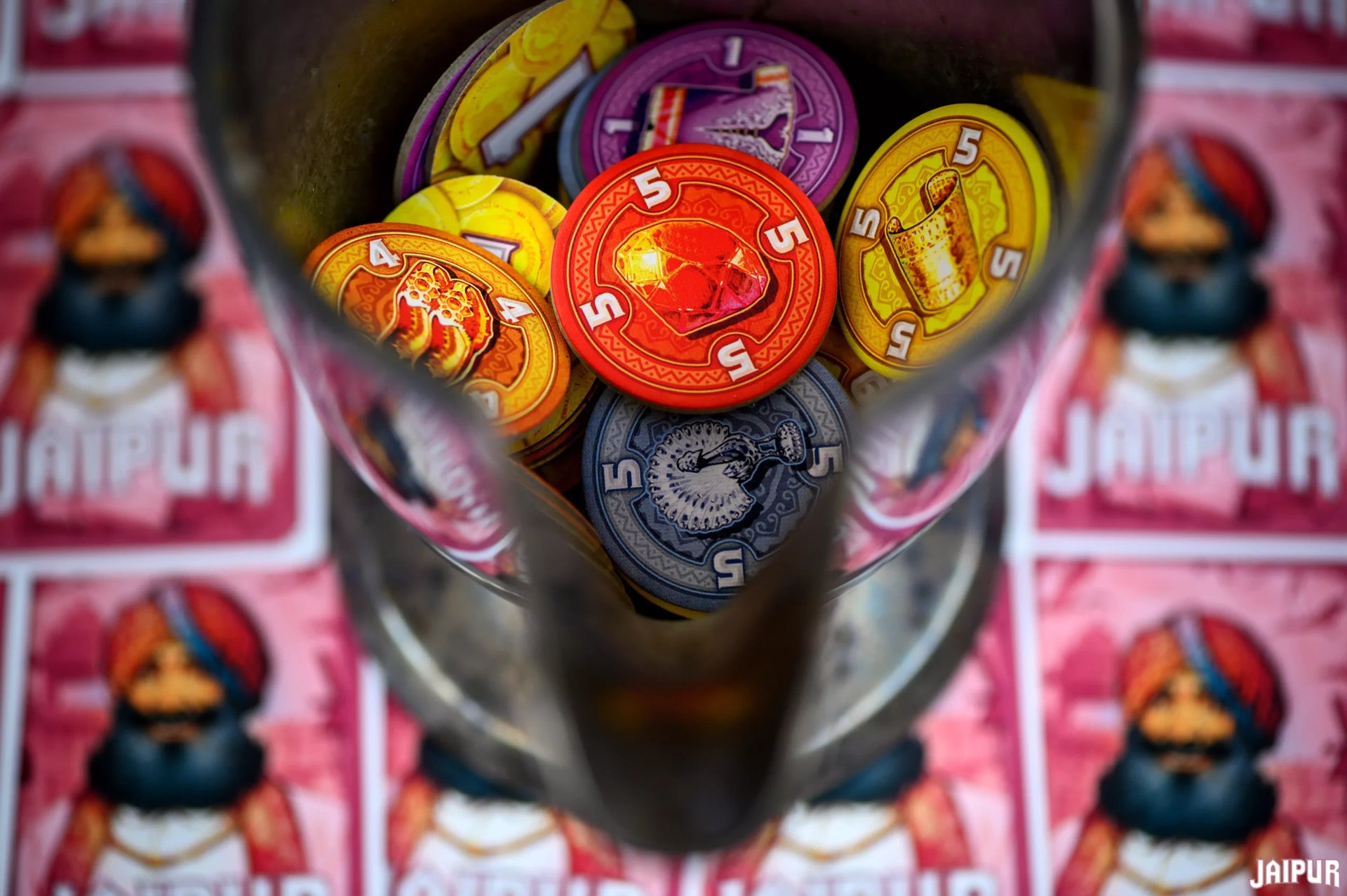 Jaipur é um jogo de cartas em ritmo acelerado, uma mistura de tática, risco e sorte. Na tua vez, podes pegar ou vender cartas. Se optares por apanhar cartas, terás de escolher entre pegar todos os camelos, pegar uma carta do mercado ou trocar 2 a 5 cartas entre o mercado e a tua mão.