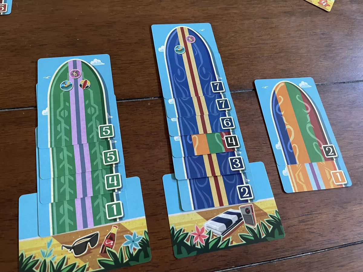Cada carta de prancha tem de 1 a 3 autocolantes, que contam como pontos quando a prancha é completada com pelo menos quatro cartas. O jogo pode terminar se um jogador tiver completado de 3 a 4 pranchas, sendo que uma delas precisa ter no mínimo 7 cartas. Se isso não acontecer antes de o baralho se esgotar, o jogo termina quando não houver mais cartas. Os jogadores então somam os pontos dos autocolantes nas pranchas completas, perdem pontos por pranchas incompletas, e ainda podem ganhar pontos extras por ter a prancha mais longa, o maior número de pranchas completas, ou por cumprir qualquer um dos quatro objetivos aleatórios revelados no início do jogo.