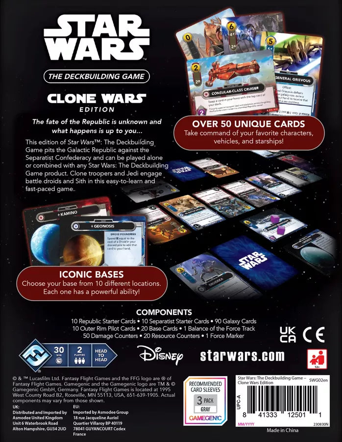 Star Wars: The Deckbuilding Game - Clone Wars Edition traz a guerra galáctica entre a República Galáctica e a Confederação Separatista para a tua mesa de jogo. Com regras fáceis de aprender, este jogo coloca-te no centro do conflito. Tu e o teu oponente escolhem um lado, jogando como República ou Separatistas, e ao longo da partida fortalecem os seus baralhos iniciais enquanto tentam destruir as bases adversárias. O primeiro a destruir três bases inimigas vence!