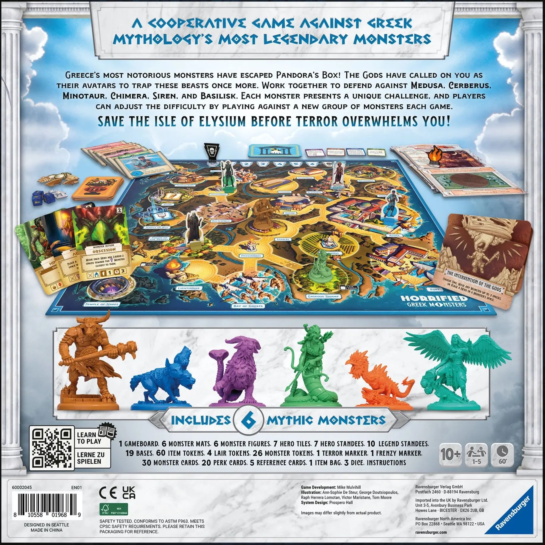 Horrified: Greek Monsters inclui seis monstros, cada um com habilidades únicas, e quanto mais monstros no jogo, mais difícil é o desafio, com os jogadores precisando usar suas habilidades únicas para descobrir como derrotar cada monstro.
