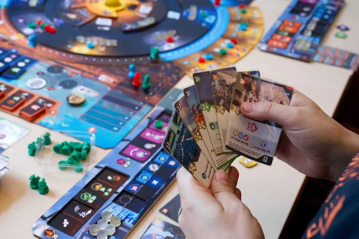 Vais também utilizar mais de 200 cartas que ajudam nos teus esforços ou orientam a tua investigação para um foco específico, garantindo bónus e recompensas adicionais. Cada carta possui efeitos e ilustrações únicas e representa tecnologias, projetos e descobertas reais (como a ISS, o Grande Colisor de Hadrões, o rover Perseverance, a sonda Voyager, entre outros).