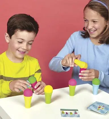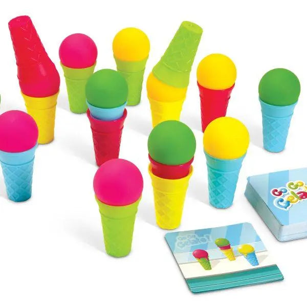 Para começar o jogo, cada jogador pega quatro cones (um de cada cor) e três bolas de gelado (em três das quatro cores), e depois coloca essas bolas nos cones correspondentes. Alguém revela uma carta de desafio, e depois todos correm para manobrar as bolas certas nos cones certos – tudo sem deixar cair as bolas ou tocá-las com as mãos. Ninguém vai querer comer isso! Cumpre o pedido primeiro e reclama a carta de desafio. Quem coletar cinco cartas de desafio primeiro vence!