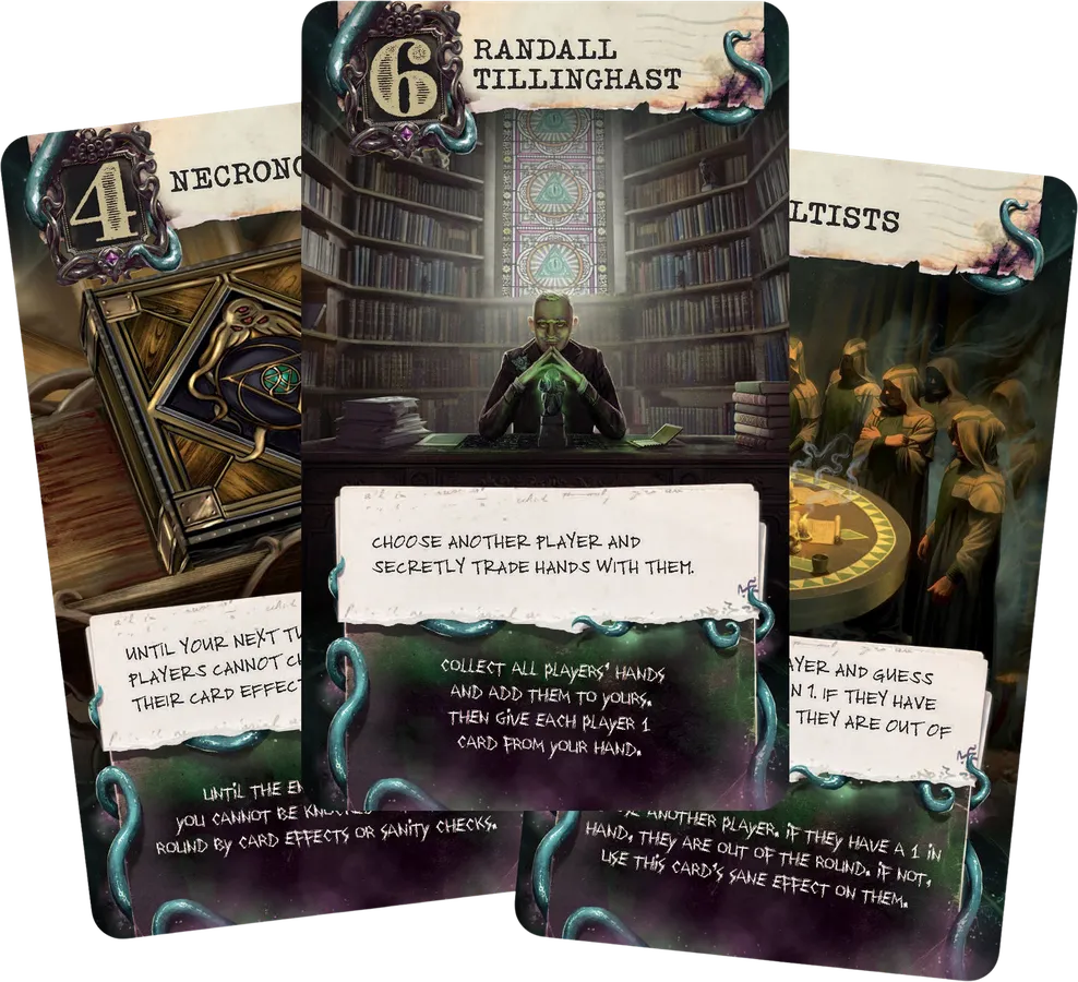 A carta na tua mão representa a pista que estás atualmente a investigar. Em cada turno, puxas 1 nova carta e depois jogas 1 das tuas 2 cartas. Jogar certas cartas leva-te à Loucura, o que te dá acesso a poderosos efeitos Insanos nas cartas que jogares, mas também te obriga a fazer um teste de Sanidade em cada turno para ver se entras em colapso total.