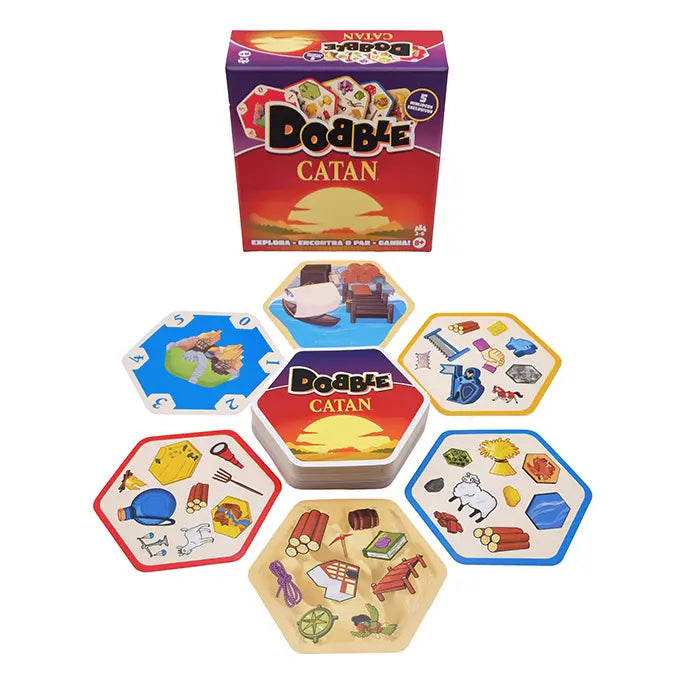 Dobble Catan leva-te à icónica ilha de Klaus Teuber para um jogo em tempo real de descoberta e exploração. No jogo, os jogadores recriam a ilha usando cartas e vivem cinco aventuras temáticas de CATAN. Em “Bem-vindo a Catan!”, por exemplo, os jogadores correm para encontrar o símbolo correspondente entre a carta que têm na mão e uma das cartas na mesa, cobrindo o máximo possível da ilha com as suas cartas.