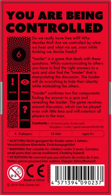 Será que realmente temos livre arbítrio? Quem decide isso? Somos controlados pelo que ouvimos e pelo que vemos, mesmo pensando que decidimos livremente? Insider é um jogo que lida com essas questões. Ao se comunicar com outras pessoas, tu deves encontrar as respostas certas para um questionário ou encontrar o “insider” que está manipulando a discussão. O “insider” fará de tudo para esconder a sua identidade enquanto engana os outros.