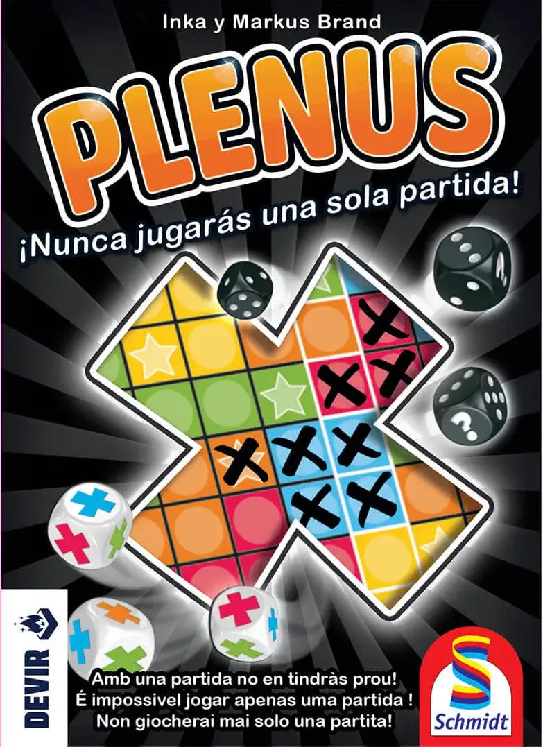Lançam-se os dados e escolhem-se dois dados, um para a cor e outro para o número. Marca os quadrados na tua ficha enquanto os outros jogadores resmungam ao riscar um número na sua ficha. Em Plenus, os jogadores têm de tomar decisões estratégicas para ganhar pontos de vitória, preenchendo colunas e cores de acordo com os dados deste revolucionário jogo de lançamento e escrita.