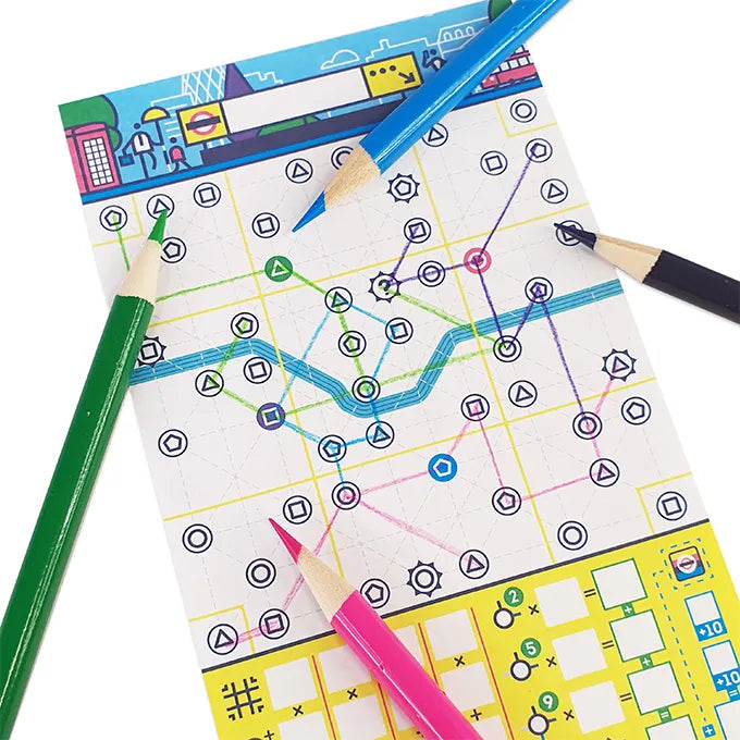 Existe um baralho de cartas com símbolos iguais aos das estações. Cada carta/símbolo que vai para a mesa fará com que tenhas de fazer, no teu papel, uma linha até uma das estações que tenha esse símbolo. Existem várias opções, mas também muitos desafios para resolver. As linhas não se podem cruzar, existem estações mais valiosas que outras e é necessário passar o rio o máximo de vezes possível para que nenhum cidadão se sinta injustiçado.