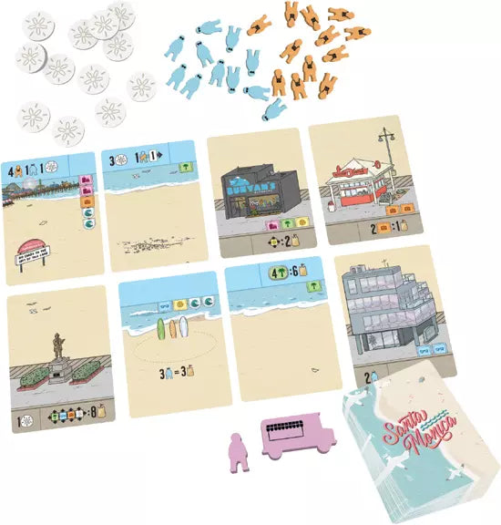 Santa Monica é um jogo que prima pela beleza e qualidade dos seus componentes, em tons suaves e ilustrações belíssimas.