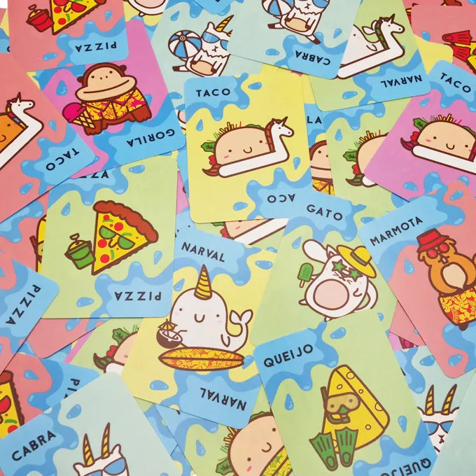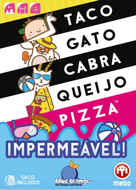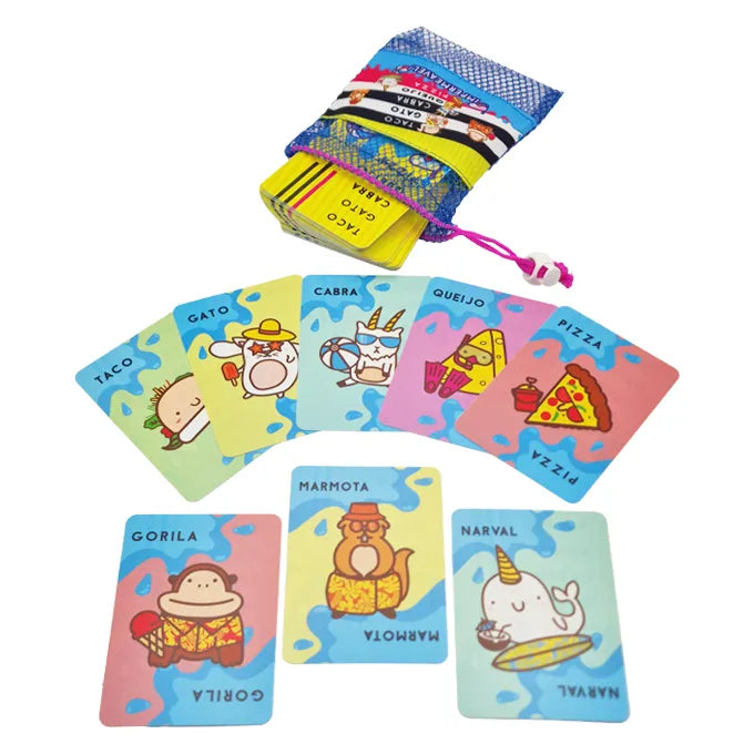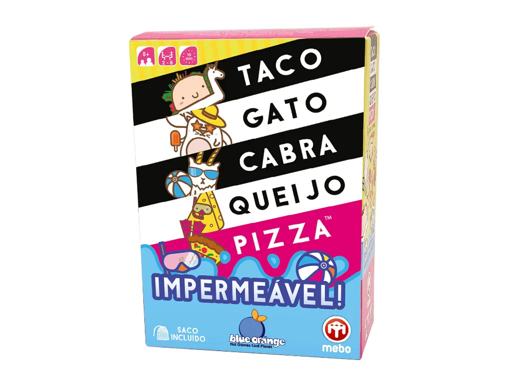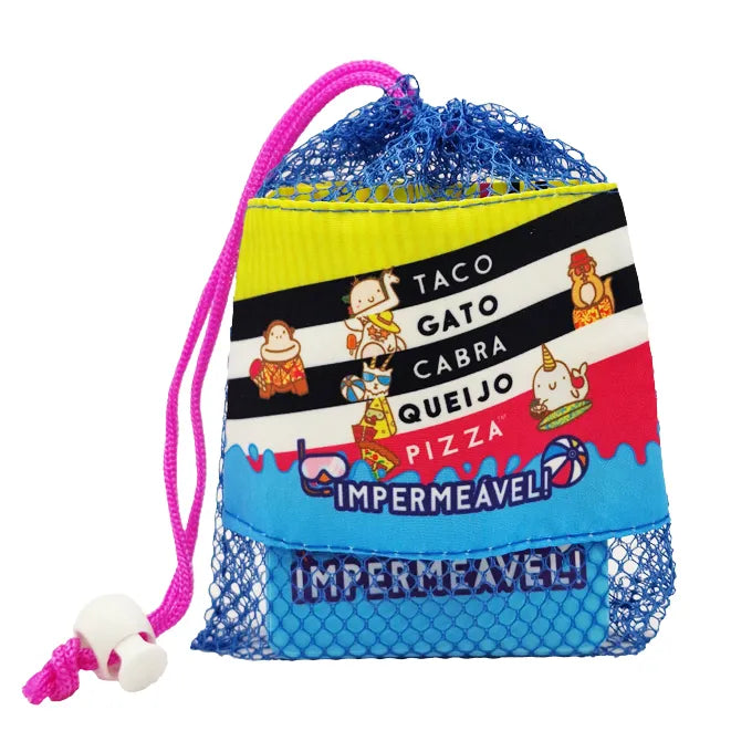 Taco Gato Cabra Queijo Pizza Impermeável! Fixa estas 5 palavras disparatadas na tua cabeça. Assim que houver correspondência entre uma carta e a palavra que foi anunciada, apressa-te a pôr a tua mão em cima da pilha de cartas central. O último jogador a pôr a mão deve receber todas as cartas. Deves ser rápido para conseguires ser o primeiro a livrares-te de todas as tuas cartas. Tem cuidado! A tua mente vai pregar-te partidas. Este jogo super viciante é tão único quanto o seu nome. Diverte-te! Agora, com cartas impermeáveis, poderás levar este jogo para qualquer destino de verão! Contém rede de transporte!