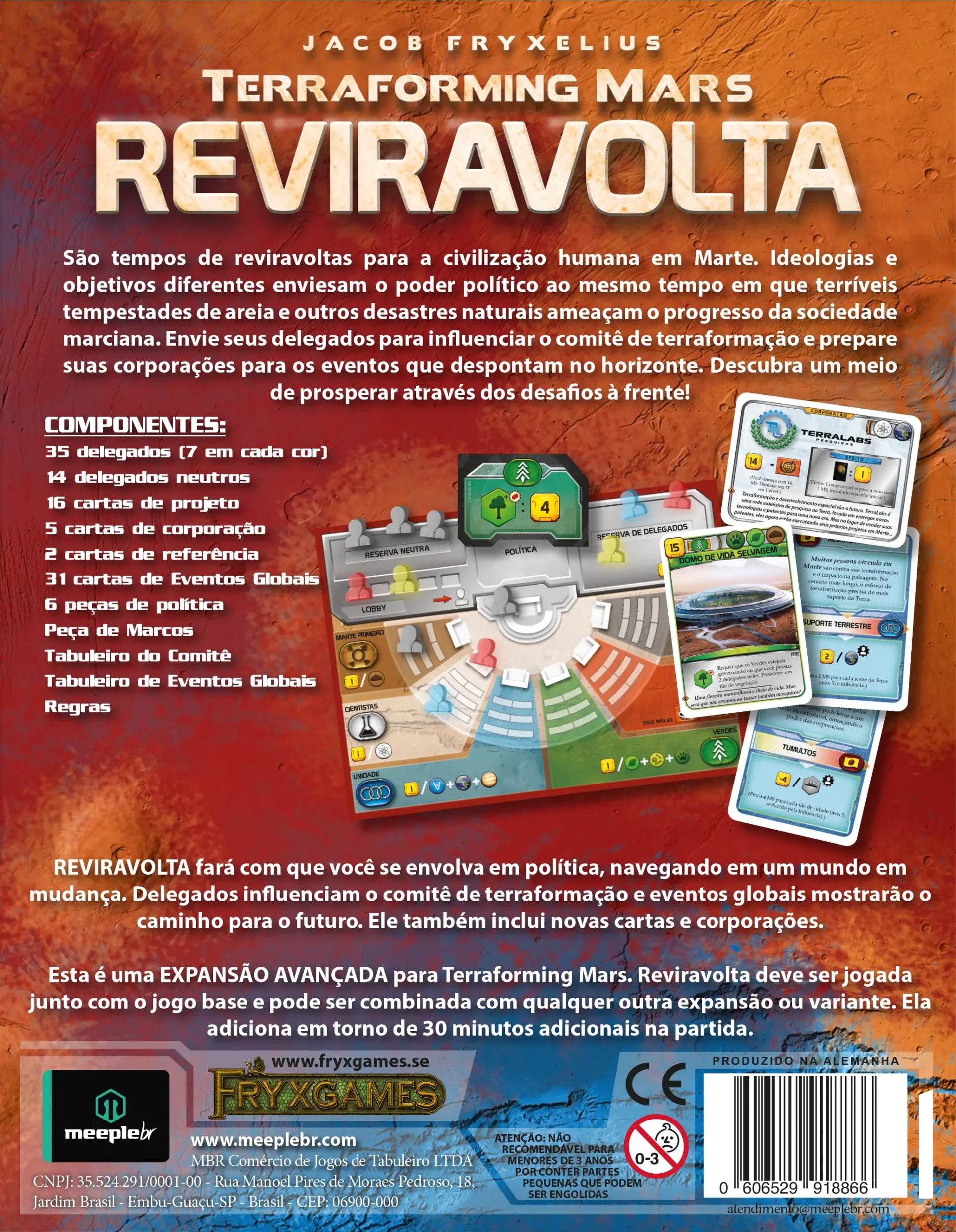Em Reviravolta, a expansão do aclamado e divertidíssimo Terraforming Mars, os jogadores terão de lidar com uma série de intrigas políticas e jogos de influência: negocia com os delegados, amplia a tua influência no Comité e torna-te no maior lobista do Planeta Vermelho.